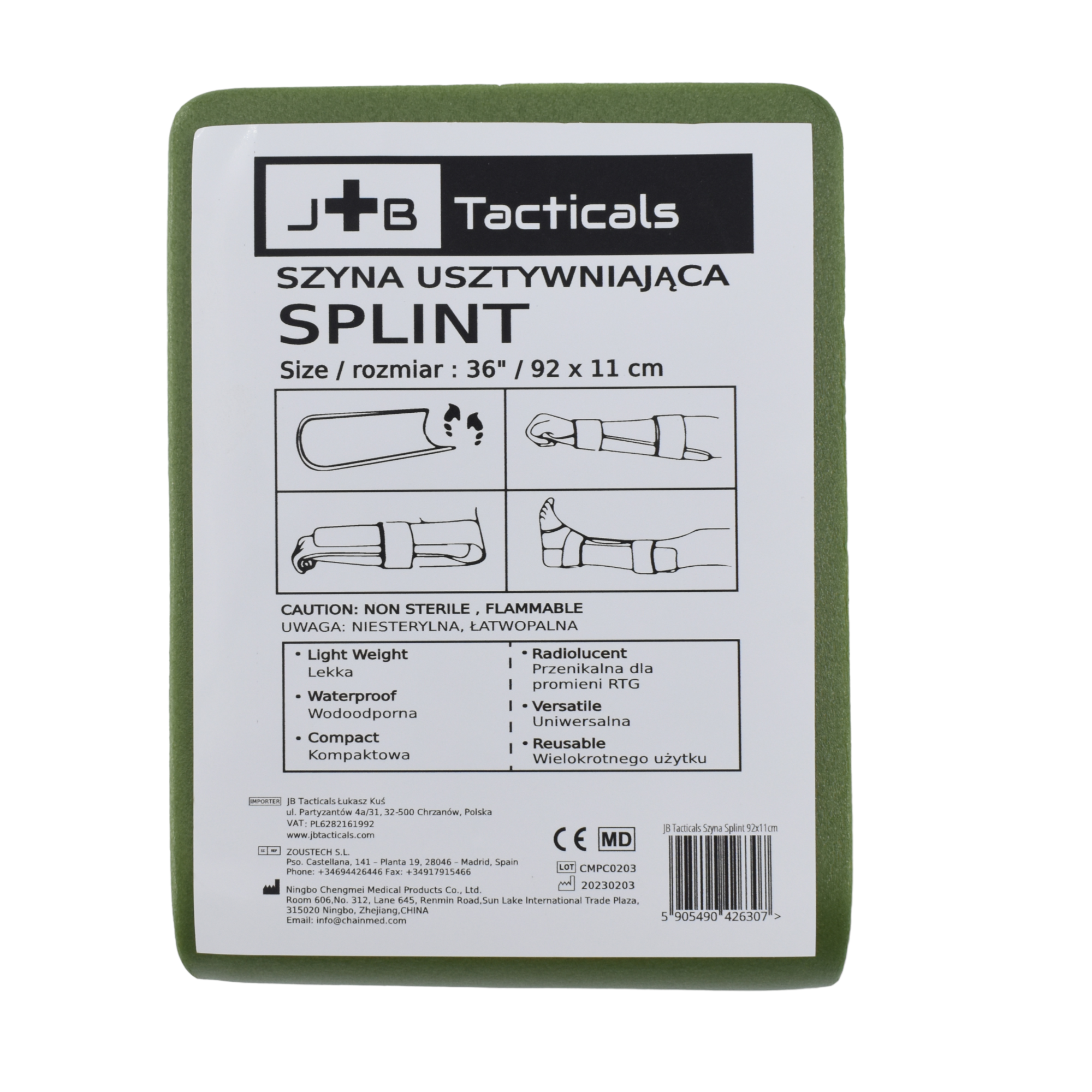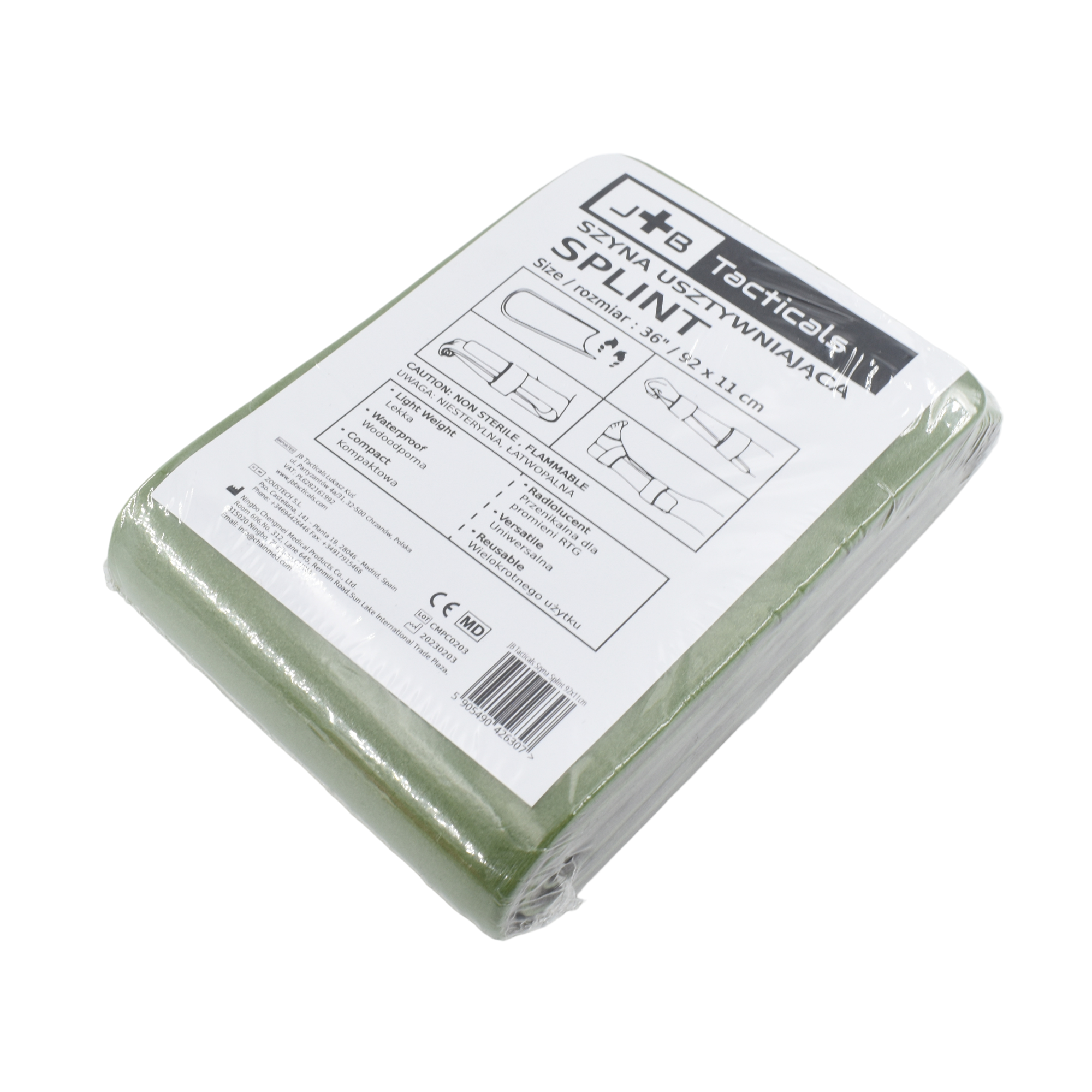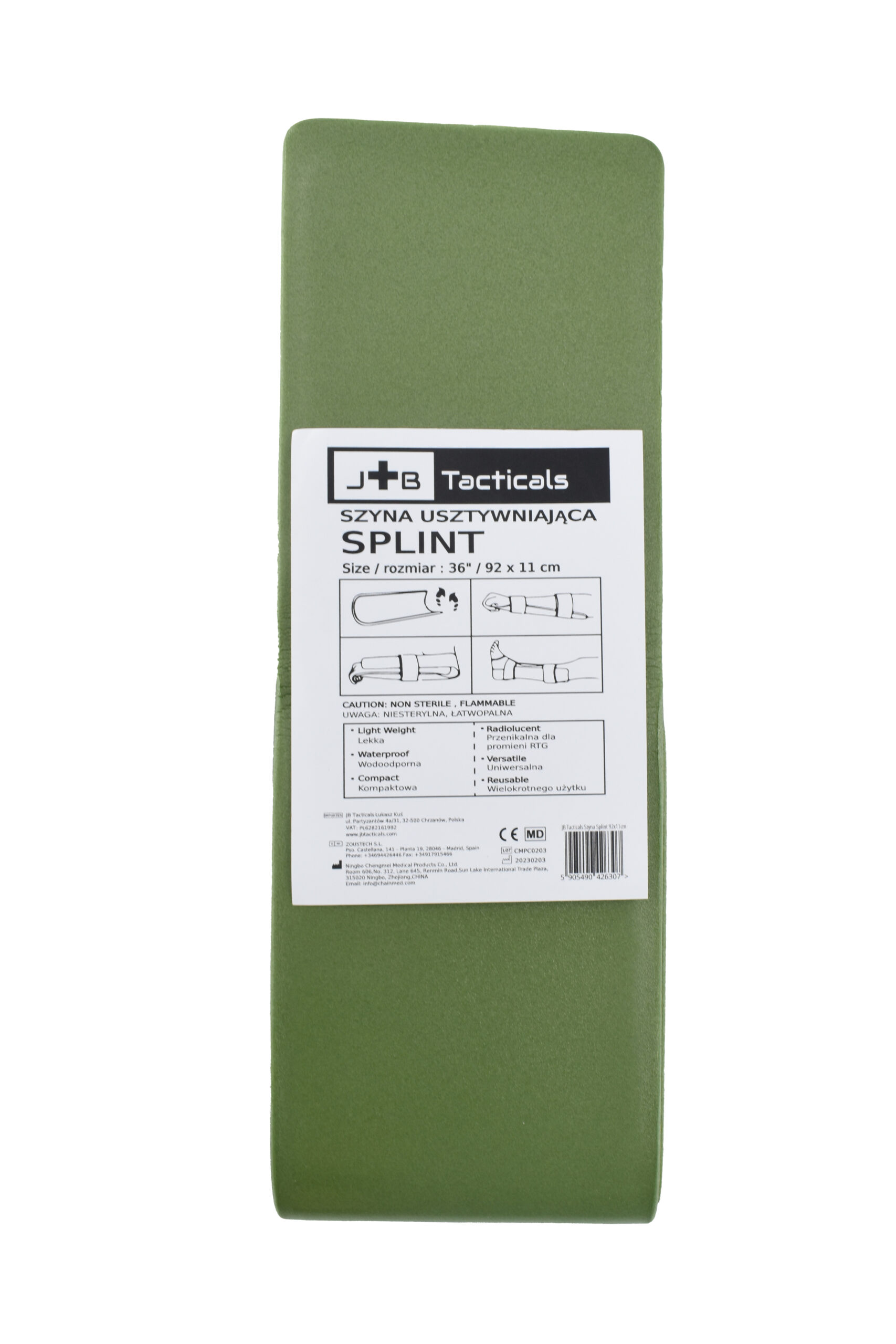 Szyna JB Tacticals Splint to rodzaj szyny typu splint, która składa się z giętkiego rdzenia aluminiowego pokrytego pianką EVA (octan winylu i etylenu), co zapewnia jej elastyczność i lekkość. Szyna JB jest stosowana do unieruchomienia urazów kończyn, w tym złamań, zwichnięć lub skręceń.