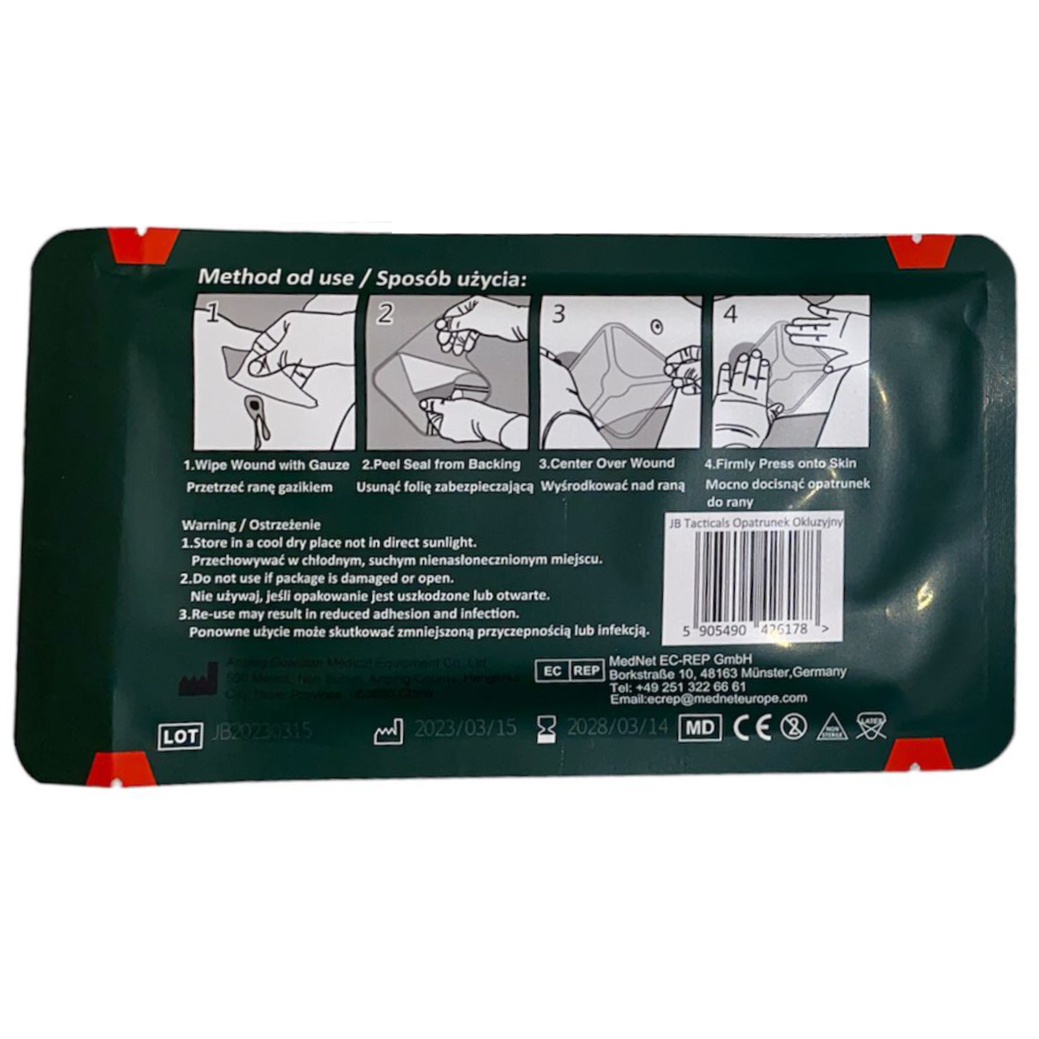 Opatrunek jest zapakowany w trwałe, wodoodporne opakowanie, które umożliwia bezproblemowe otwieranie. W opakowaniu znajduje się również gaza, służąca do wstępnego oczyszczenia miejsca krwawienia z brudu, krwi i innych zanieczyszczeń. Produkt jest bezpieczny dla skóry, nie zawiera lateksu i nie wywołuje podrażnień ani reakcji alergicznych.